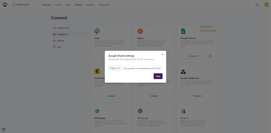 ChatFlow can automatically send connection data to Google Sheets, making it easy to track and analyze your chatbot’s interactions. Here’s how to set up the integration:
