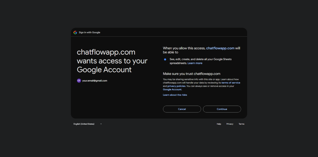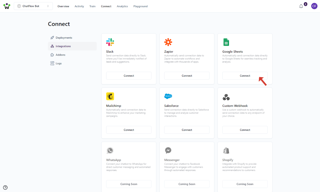 ChatFlow can automatically send connection data to Google Sheets, making it easy to track and analyze your chatbot’s interactions. Here’s how to set up the integration: