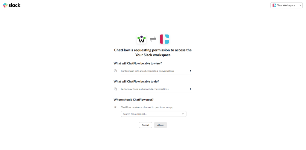 Once authorized, ChatFlow will be connected to your Slack workspace. You can: